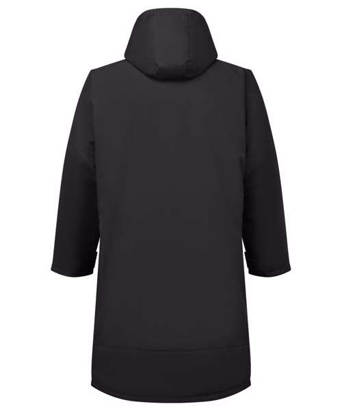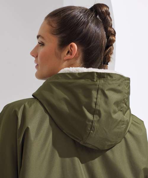Unisex. Oversized. Full-length two-way plastic zip with easy pull toggles. Chin guard. Oversized fit. Side vents. Adjustable cuffs with hook and loop fastening. Side zip pockets. Inside pocket with zip on the left side. Inside patch pocket on the right side. 3-panelled hood. Loop on the centre back of the jacket for hanging the robe. Dropped back hemline. (5000/5000 waterproof and windproof). Embroidery access to the back and chest area can be accessed through here. Waterproof taped seamed outer layer. Sherpa fleece interior. Rebrandable stuff sack carry bag with double drawstring straps. CE Class 1 Certified.